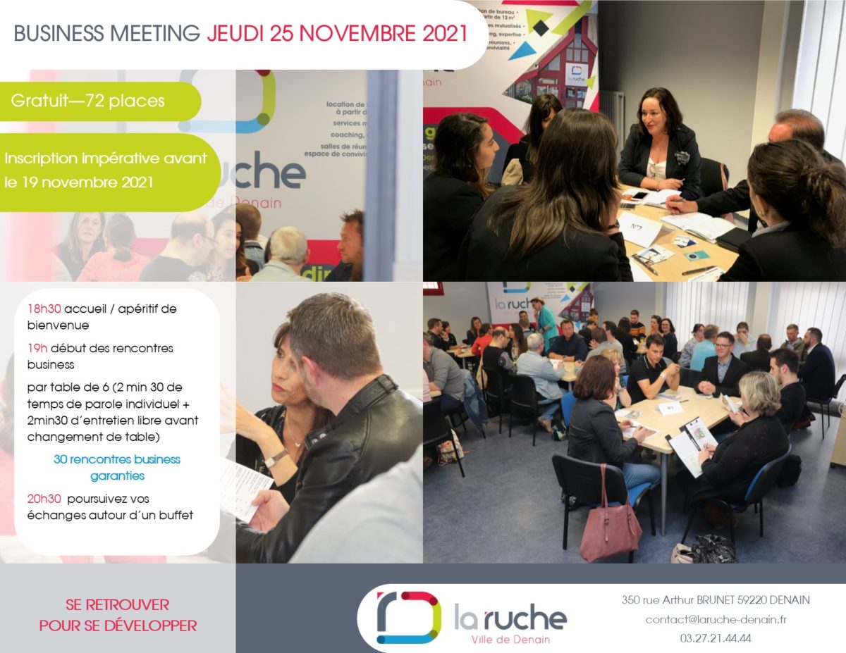 Le business meeting de la ruche c’est l’occasion pour vous de rencontrer un minimum de 30 prospects potentiels et jusqu’à 70 en une soirée. Cet évènement gratuit mais au nombre de places limité, est organisé deux fois par an. Créateurs, jeunes entreprises, PME, c’est l’occasion pour vous de faire parler de vous en un minimum de temps.